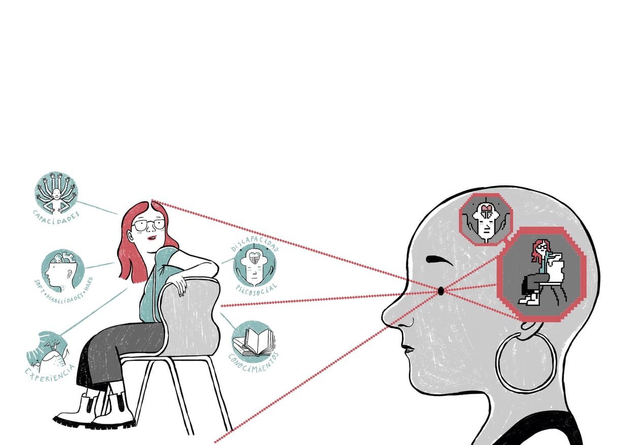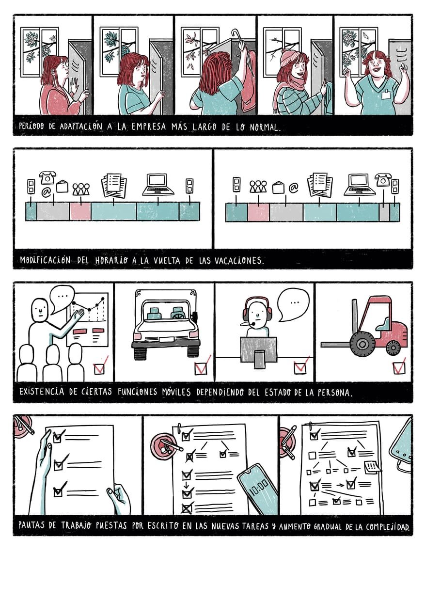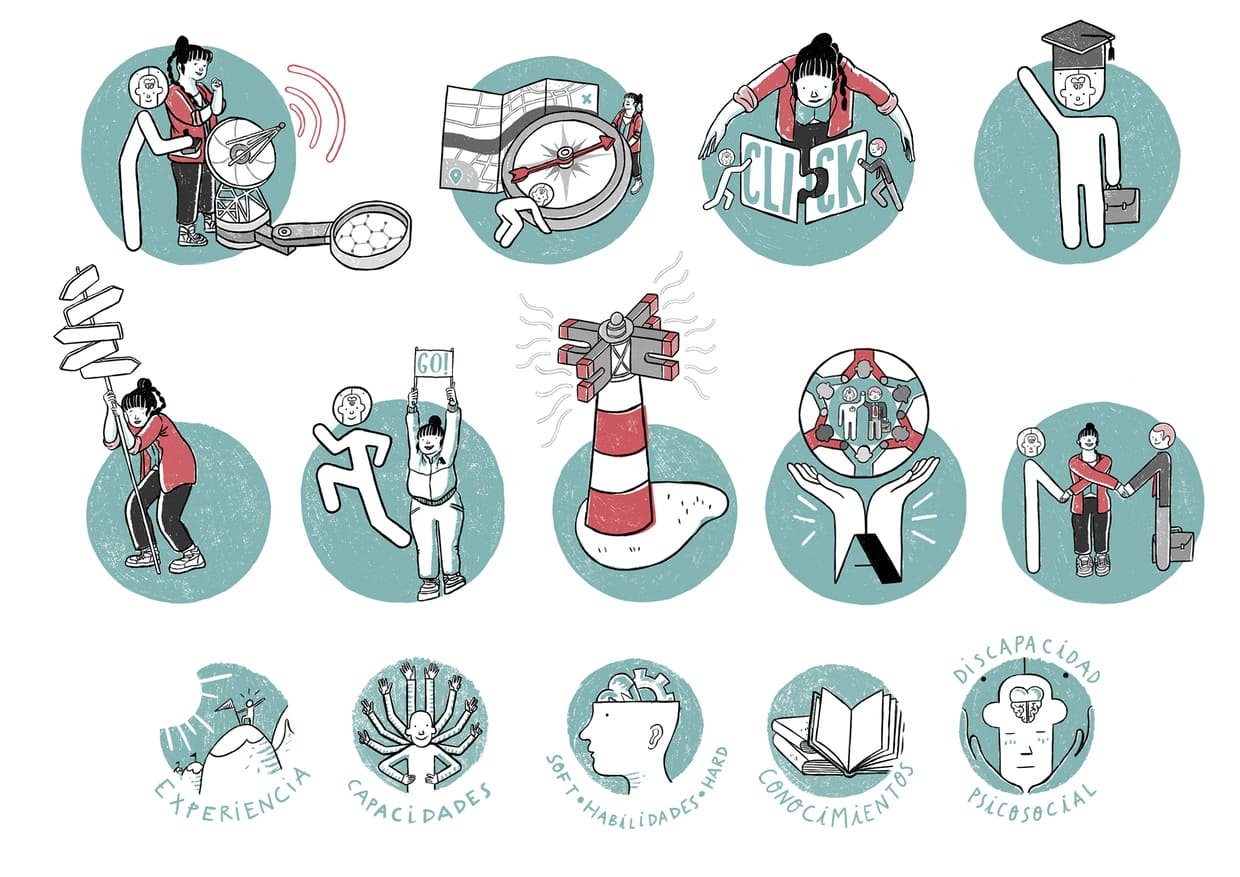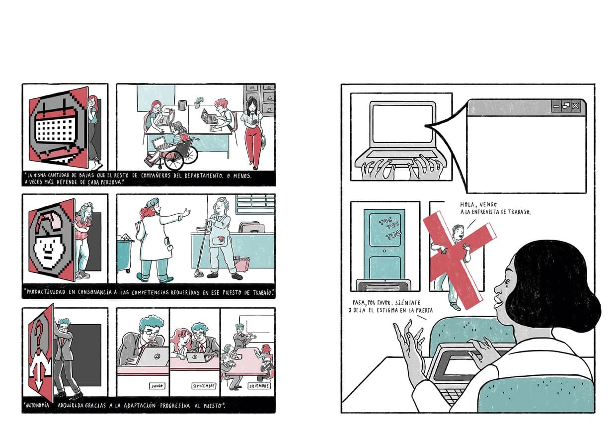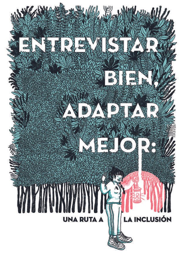 Ilustraciones, Copy y Rotulación para ilustraciones de una guÃa de comunicación dirigida a Departamentos de Recursos Humanos con el fin de mejorar la inclusión laboral de personas con discapacidad psicosocial.